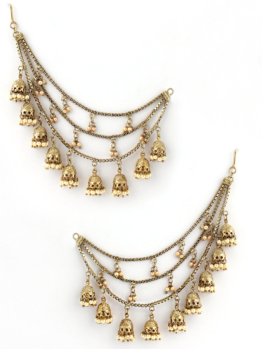 This gold tone 3-layered ear chain is adorned with faux pearls, adding a touch of elegance to your ensemble. The chain measures approximately 150mm or 6 inches in length and is crafted from high-grade alloy metal. The design combines traditional elements with modern aesthetics, making it a versatile and stylish accessory.
