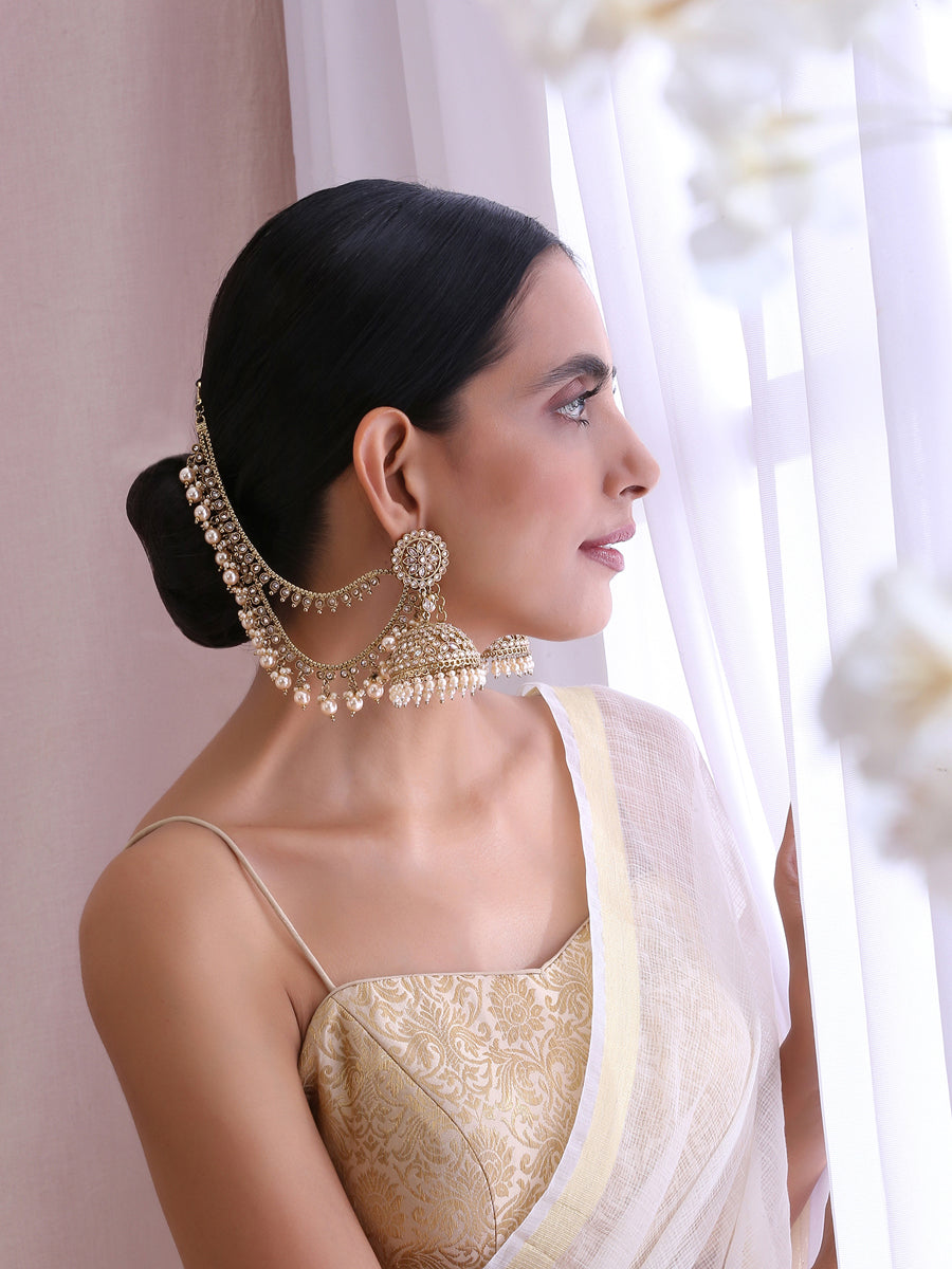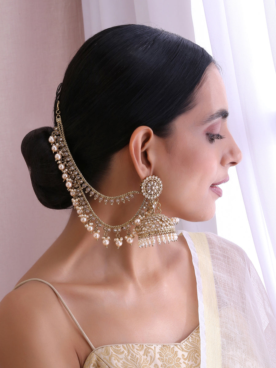 • Antique Gold Tone 2 layered Ear Chain Studded with Simulated Polki Color Stones and Beads. Please note: earrings are sold separately.