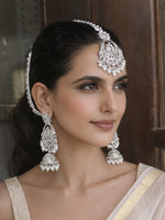 Gold tone long Jhumki earrings and tikka studded with simulated polkis, faux pearls, multicolored stones, and beads. Measures approx.: 100 x 25mm OR 4" x 1" with post back findings for pierced ears. Tikka measures: Length (approx.) - 6 1/2" Width: (forehead side) 35mm or 1 1/2". Base: High-grade alloy metal