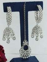 Gold tone jhumki earrings and tikka set, embellished with simulated polkis, faux pearls, multicolored stones, and beads. The earrings measure approximately 85 x 20mm (3 1/2" x 3/4") with post-back findings for pierced ears. The tikka measures approximately 5 1/4" in length with a width of 25mm (1") on the forehead side. Crafted from high-grade alloy metal.