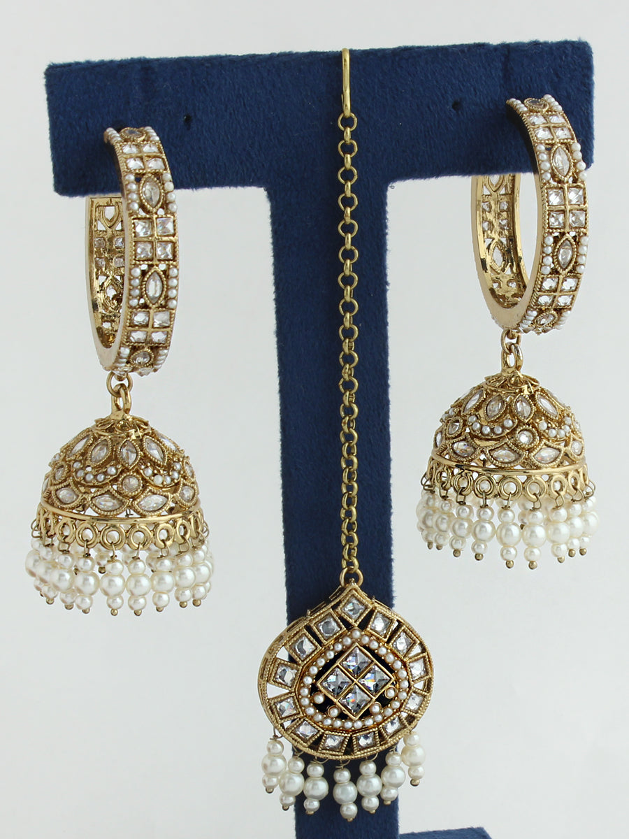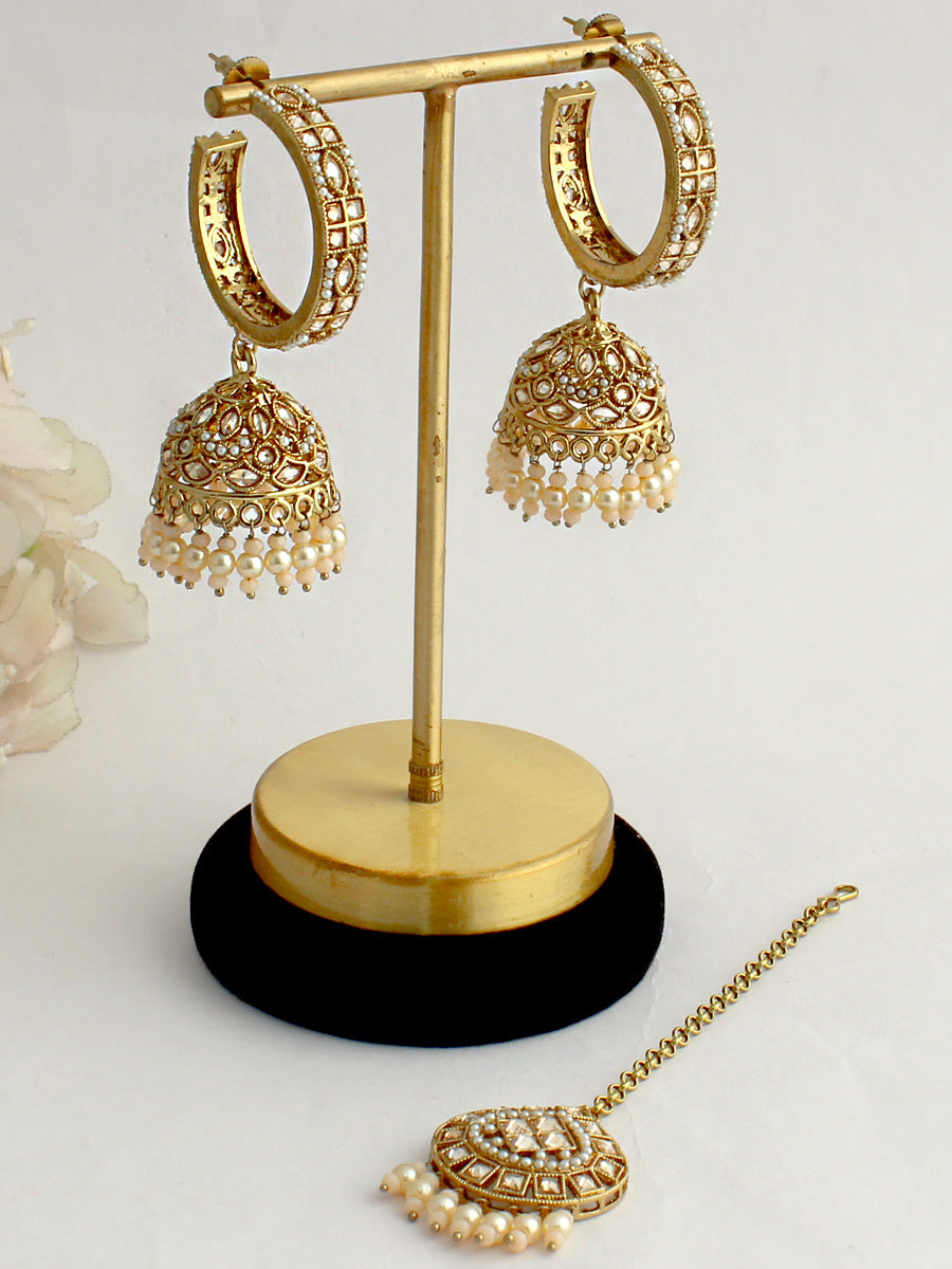 Gold Tone Jhumki Earrings and Tikka Set with Simulated Polkis, Faux Pearls, and Multicolored Stones