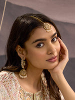 Elevate your ethnic look with this Gold Tone Jhumki Earrings and Tikka Set. The combination of simulated polkis, faux pearls, and vibrant stones adds a festive and traditional touch to your ensemble. The timeless jhumki design and adjustable tikka make it a versatile accessory for various occasions.