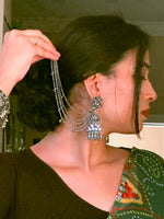 Dangle jhumka/jhumki earrings in oxidized silver tone, adorned with simulated stones and silver beads. They measure approximately 80 x 15mm (3 1/4" x 1/2") and come with an ear chain and post-back findings for pierced ears. Crafted from high-grade alloy metal.