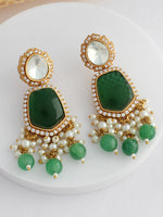 Gold tone dangle earrings studded with simulated polki diamonds, CZs, pastel pink stones and beads.