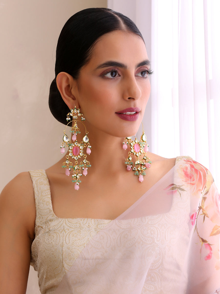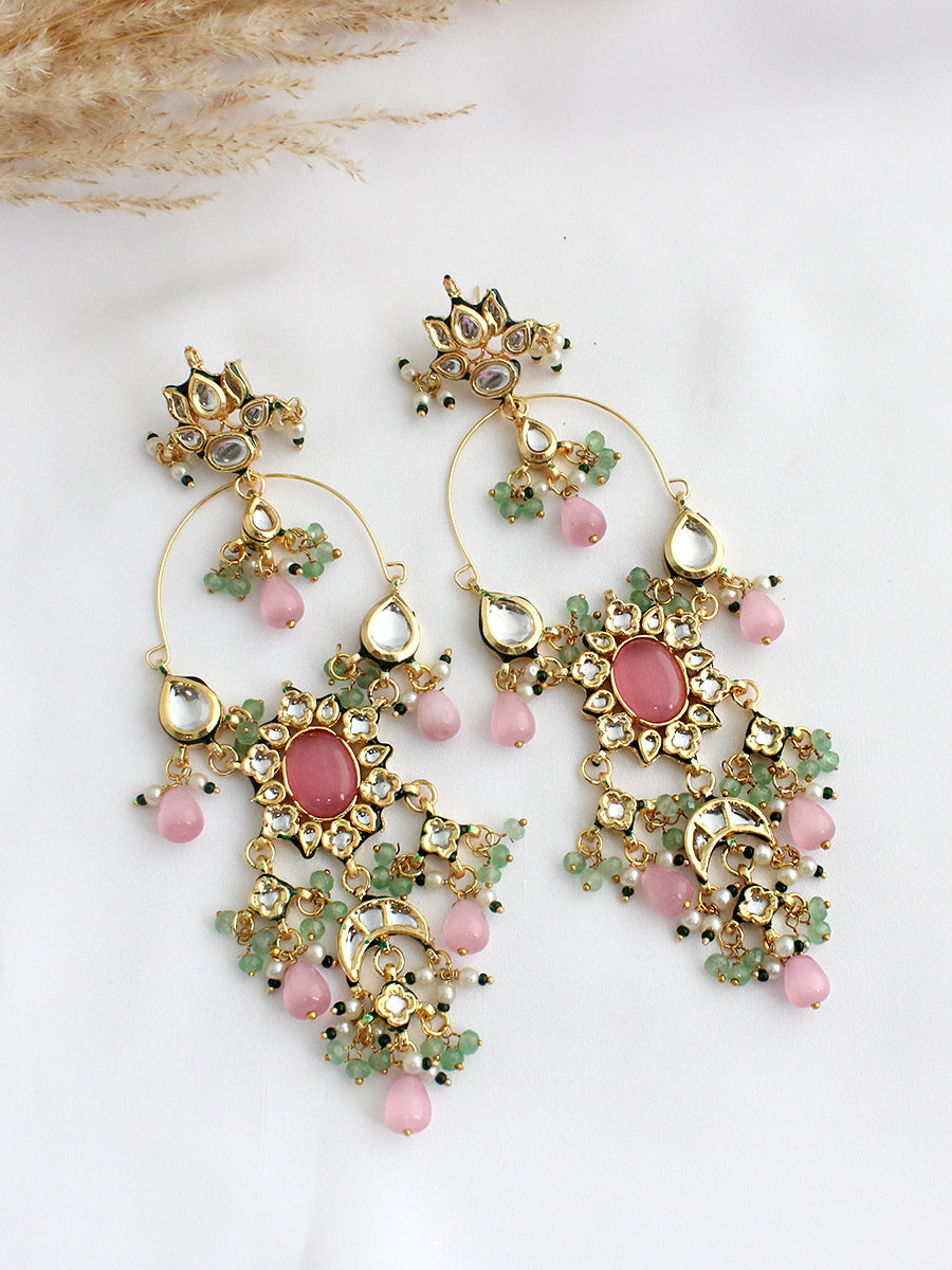 The gold-plated long earrings studded with simulated Kundans, mint green, pink stones, faux pearls, and beads are a striking and elegant accessory. Here are the details: