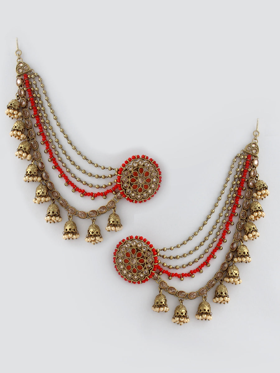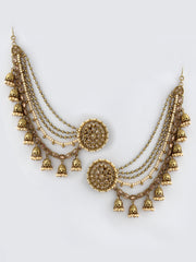These exquisite stud earrings are designed with intricate detailing, featuring simulated Polkis, CZs, multi-color stones, and beads. The earrings measure approximately 35mm in length and 30mm in width, providing a delicate and charming look. The set includes a 5-layered ear chain that adds a touch of elegance to the overall design. With post back findings for pierced ears, these earrings are not only stylish but also versatile. Additionally, the ear chains are detachable, allowing you to customize your look based on your preference. Crafted from high-grade alloy metal, these gold-tone stud earrings are a perfect choice for various occasions.