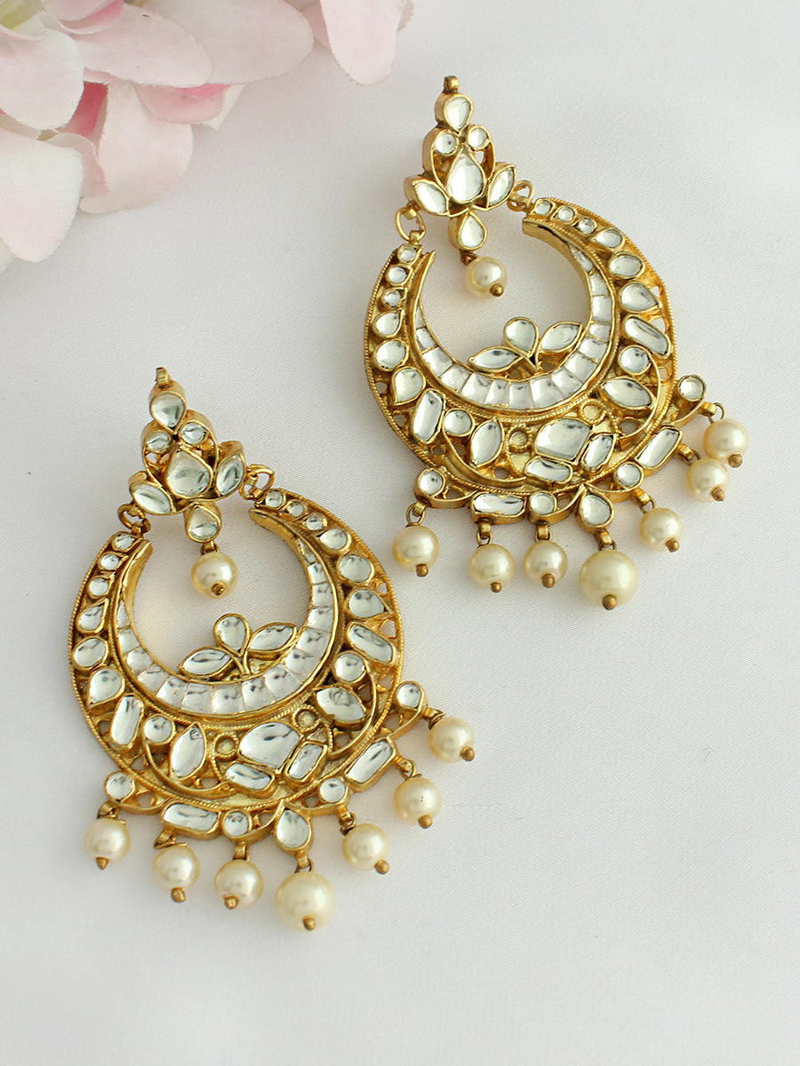 Introducing an exquisite gold Plated chandbali earrings, adorned with simulated Kundans and faux pearls for a stunning and versatile ensemble. Crafted on a base of high-grade alloy metal. The post-back findings ensure secure and comfortable wear. The Chandbali style has been embraced not only in traditional Indian jewelry but has also influenced contemporary and fusion designs, making it a timeless and versatile choice for those seeking a touch of cultural elegance in their jewelry.