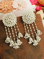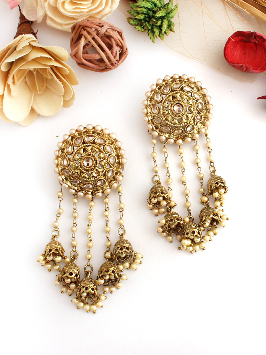 The Gold/Silver Tone Jhumki Earrings are studded with simulated polki and faux pearls. They measure approximately 105x40mm or 4 1/4" x 1 1/2" and come with post back findings for pierced ears. The base is made of high-grade alloy metal.