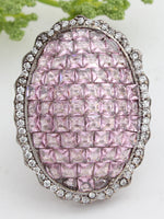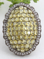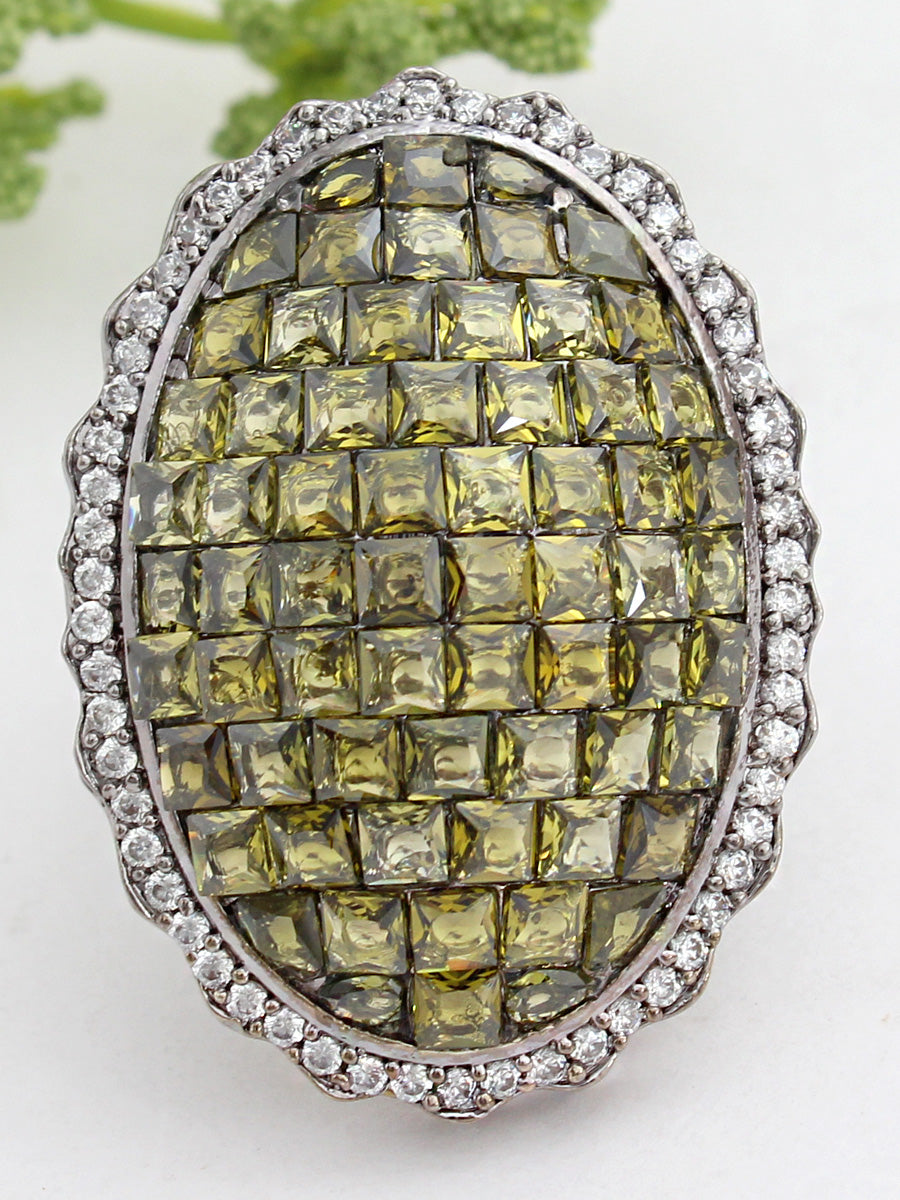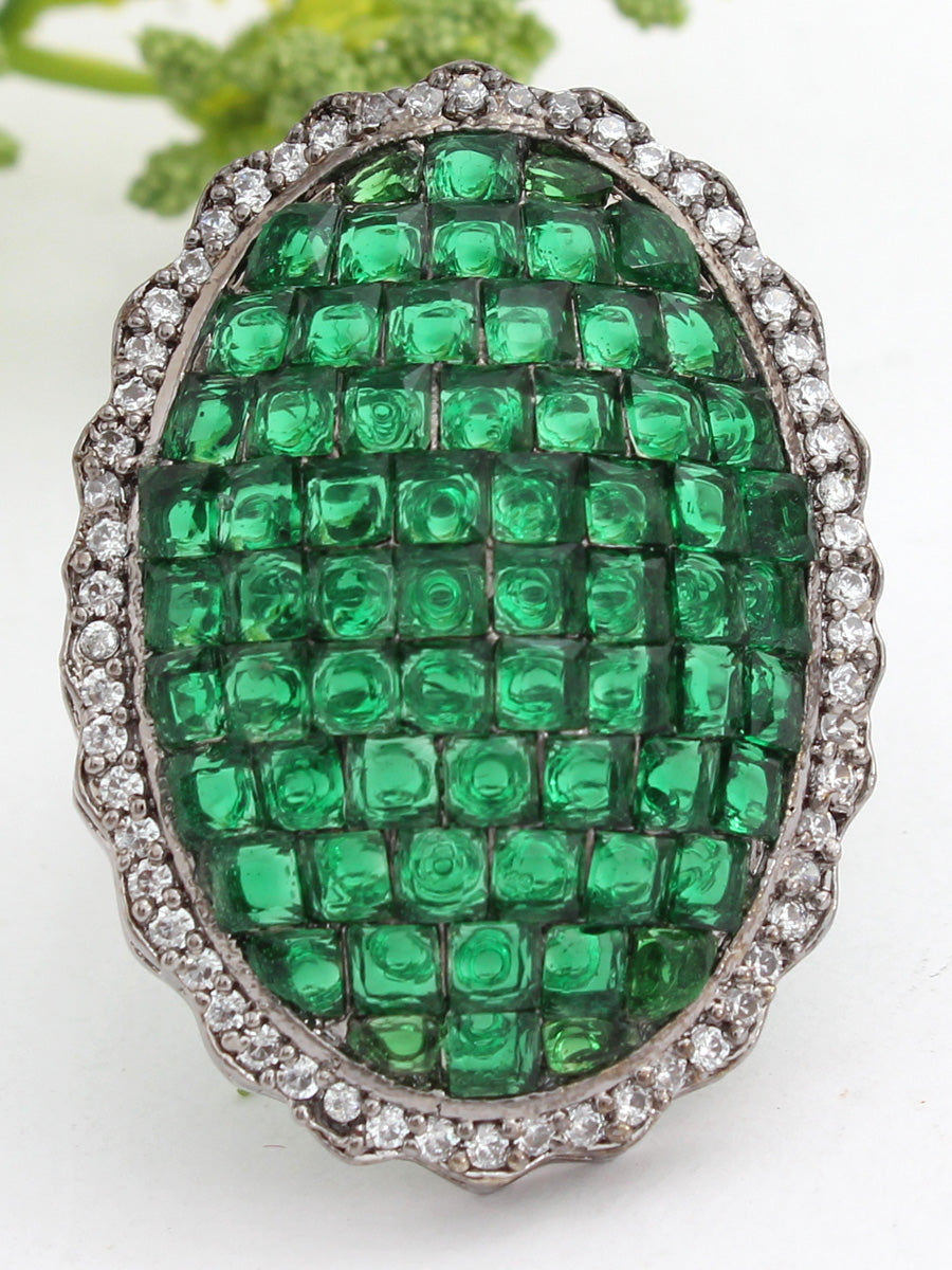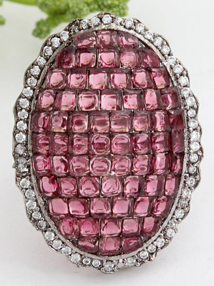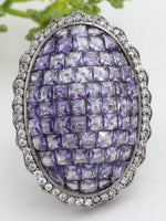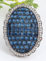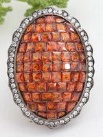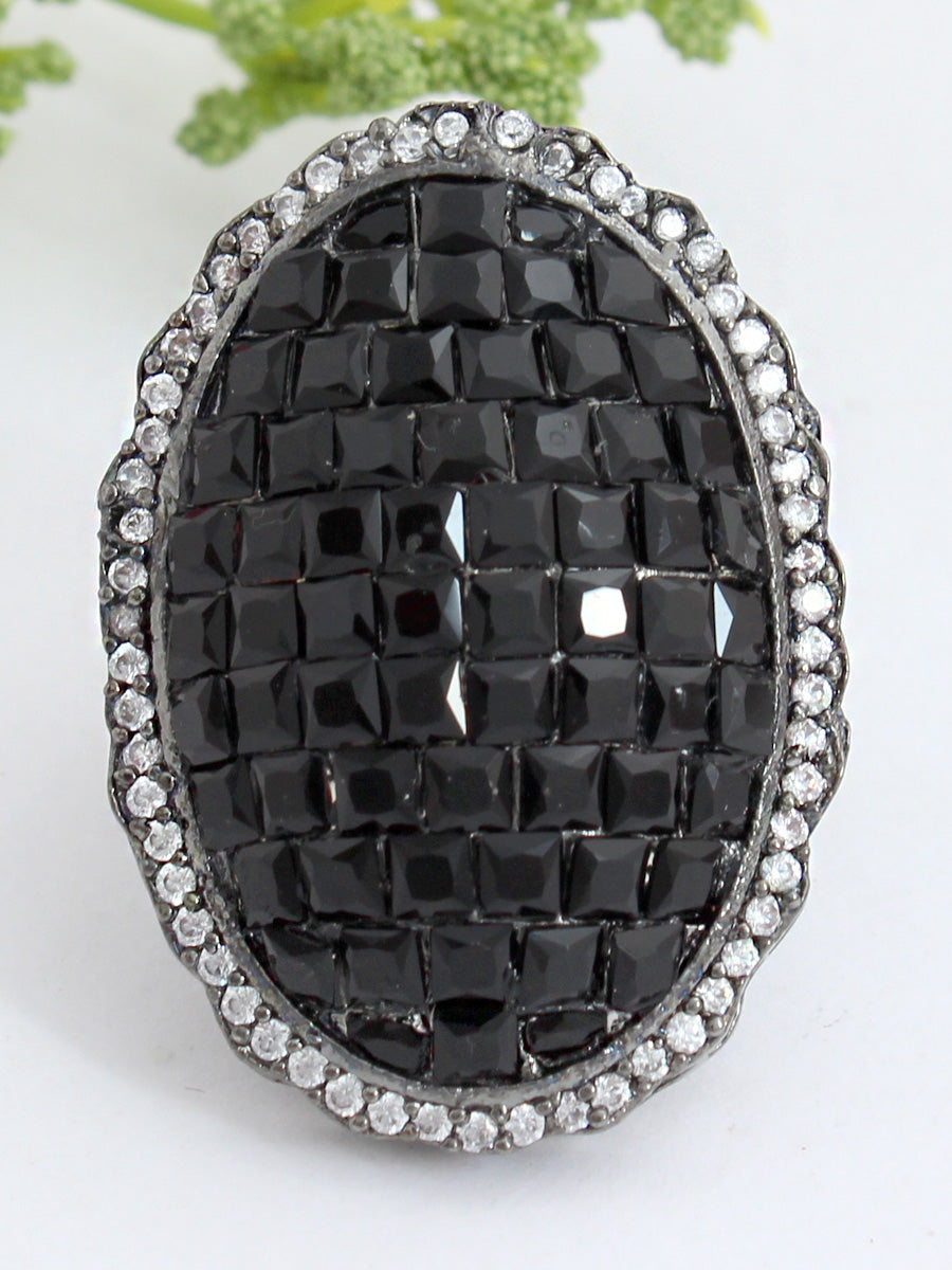 The antique silver tone finger ring is studded with simulated diamonds (CZs) and multi-color crystal stones. The size is adjustable, and the ring measures approximately 30mm or 1 1/4". The base is made of high-grade alloy metal.