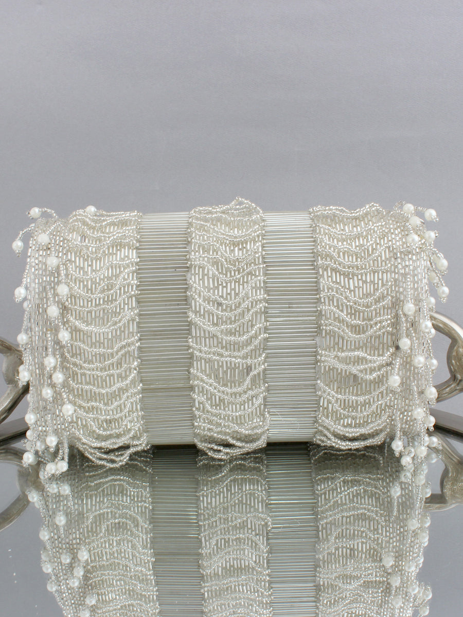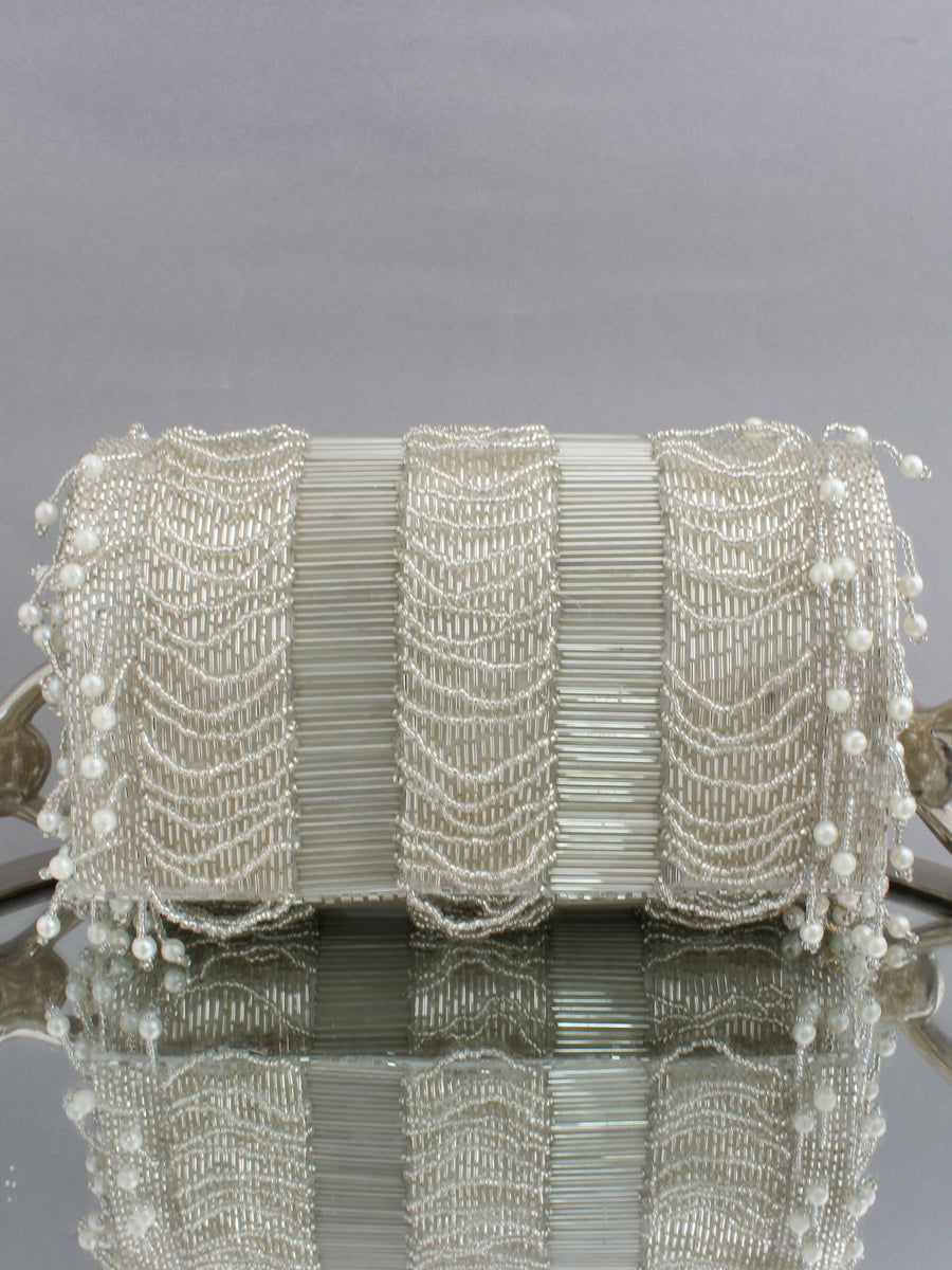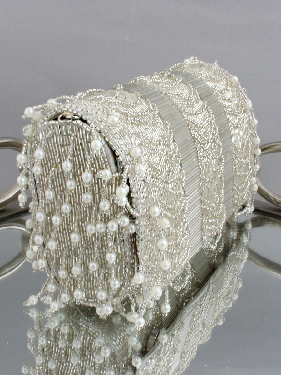 This flap bag /clutch / purse adorned with pearls & shiny glass beads, the bag has a magnetic closure and an optional detachable embellished handle. This collectible statement accessory fits in your valuables like a smartphone, makeup, keys, currency and cards.