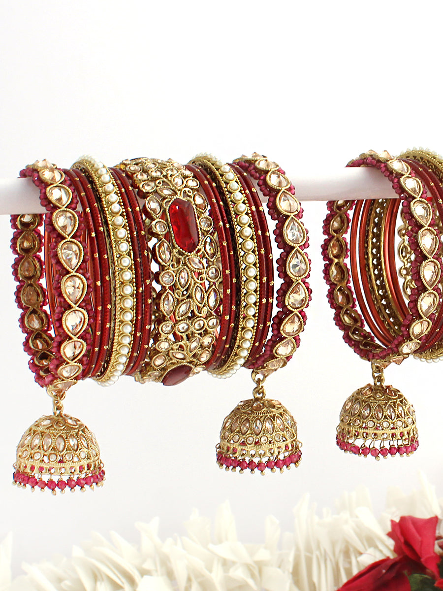 The 26-piece 2 Sets maroon bangle set is a stunning collection designed to enhance your style and add a touch of elegance to any occasion. This set includes both hands' worth of bangles and features intricate detailing.
