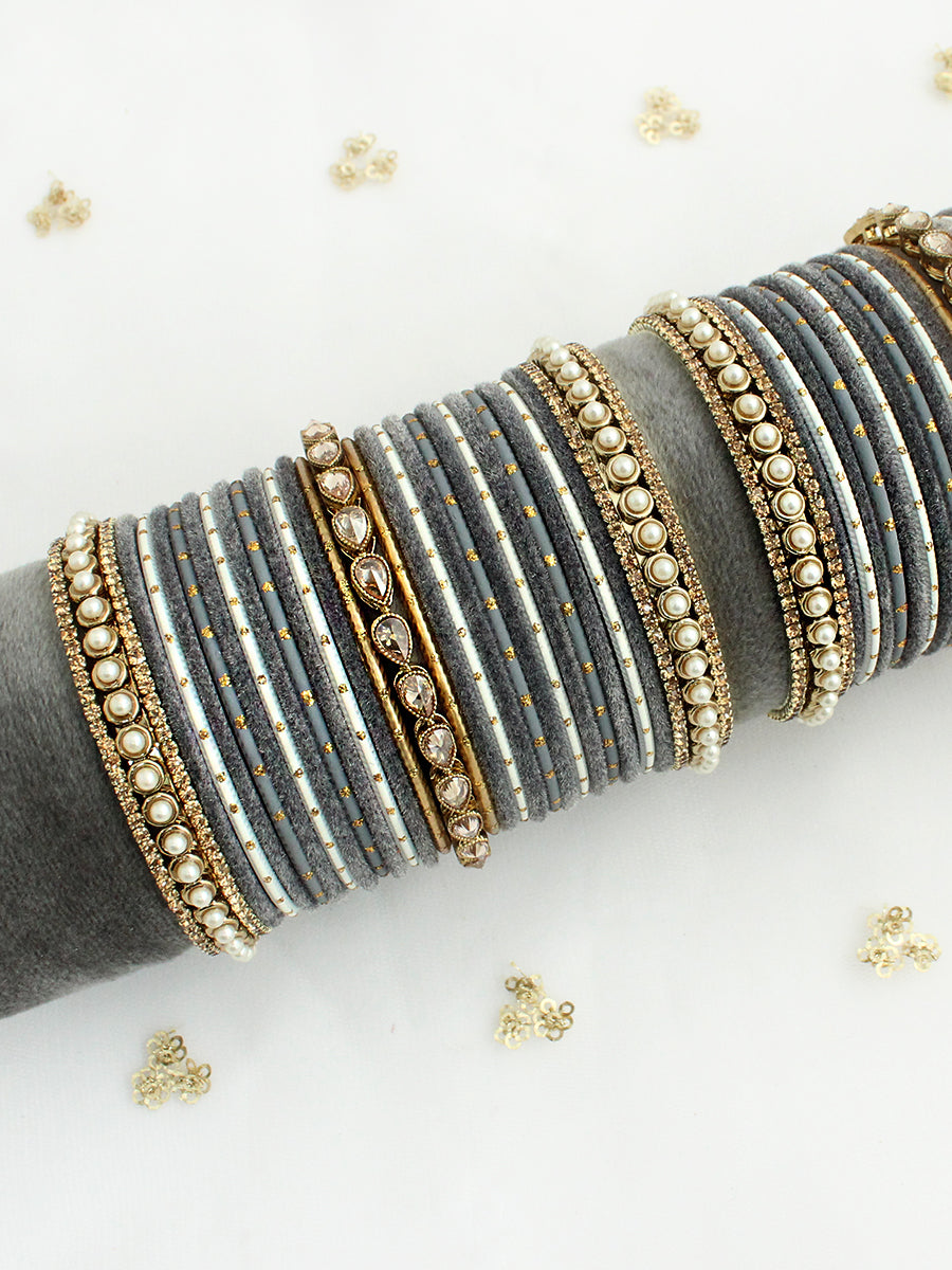 Introducing our 62-Piece (2 Set) Gold Tone Grey Bangle Set – a stunning collection designed to elevate your style for any occasion. This exquisite set showcases a harmonious blend of Grey bangles, adorned with simulated faux pearls,CZs And Polki stone. The combination of these elegant elements creates a sophisticated and timeless accessory that will enhance your ensemble. Whether you're attending a special event or adding a touch of luxury to your everyday look, this bangle set is the perfect choice for a refined and graceful finish.