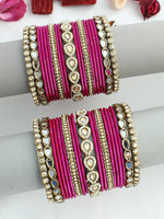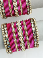 Introducing a Beautiful 38-Piece (2 Set) Hot Pink ( Rani Pink) Bangle Set, adorned with Mirrors, Czs and faux pearls beads for a touch of sophistication and glamour. Crafted from high-grade alloy metal, this set exudes both elegance and durability. The intricate design, combined with the sparkling polkis, makes it the perfect accessory for special events and celebrations. Designed to fit both hands, this set features exquisite detailing that adds a luxurious flair to any occasion.