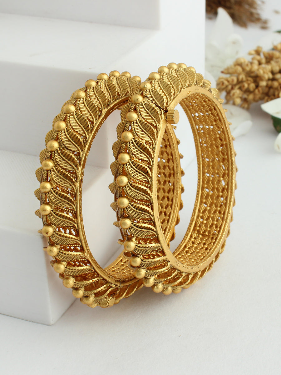Introducing Our Gold-Plated Screw Opening Bangle Set: Elegance meets functionality in our Gold-Plated Screw Opening Bangle Set, meticulously crafted on a base of high-grade alloy metal. This exquisite pair of bangles not only adds a touch of timeless charm to your ensemble but also features a convenient screw opening design, ensuring both style and ease of wear. Elevate your look with these beautiful bangles, making a statement of sophistication on any occasion.