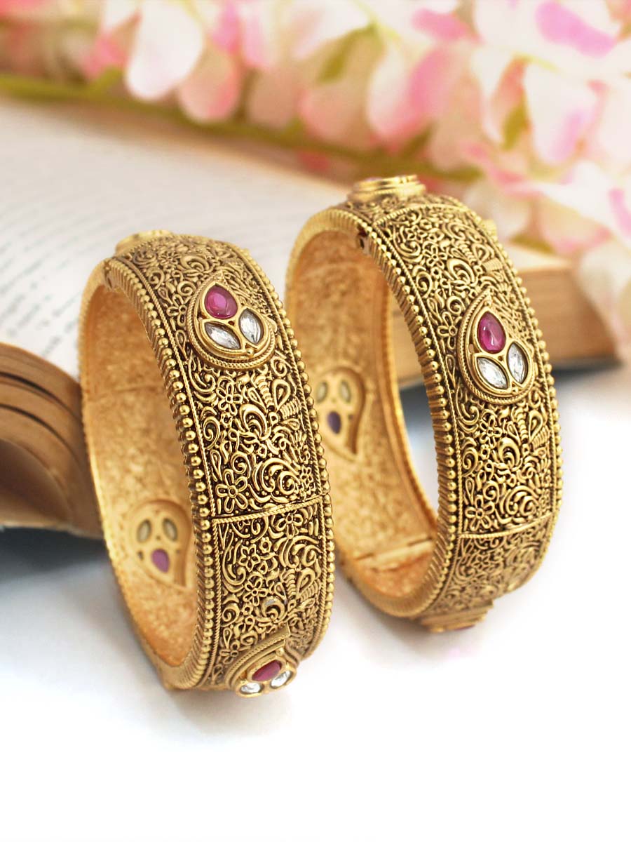 Introducing our Gold-Plated Screw Opening Bangle Set, adorned with radiant Ruby Pink Stones for a touch of sophistication. Crafted on a base of high-grade alloy metal, this pair of bangles features a convenient screw opening design, combining style and ease of wear. adding a touch of elegance to any occasion, each piece tells a story of tradition, craftsmanship, and devotion, capturing the essence of timeless beauty.