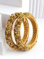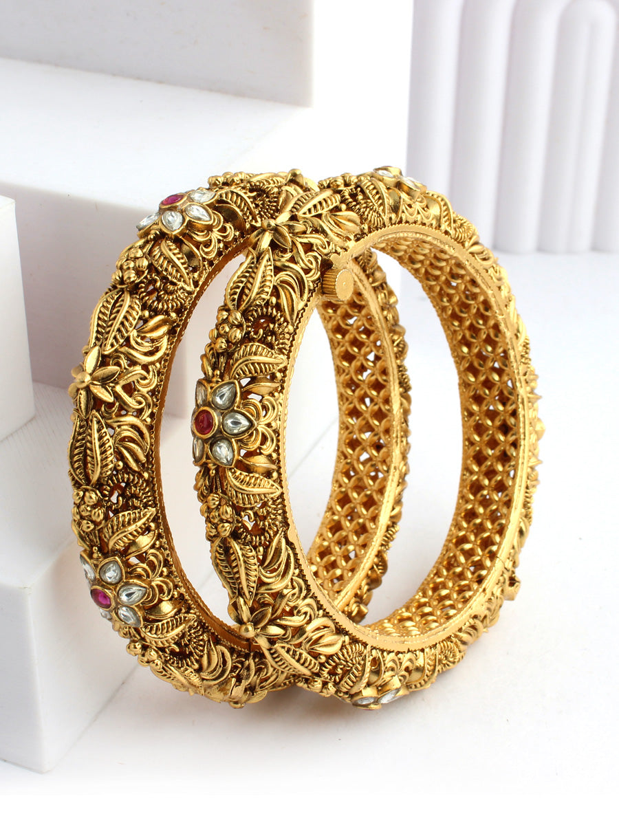 Introducing our South Indian Style Gold-Plated Screw Opening Bangle Set, adorned with simulated Polki Diamonds and radiant Ruby Pink Stones for a touch of sophistication. Crafted on a base of high-grade alloy metal, this pair of bangles features a convenient screw opening design, combining style and ease of wear. Elevate your ensemble with the timeless charm of these beautifully studded bangles, adding a touch of elegance to any occasion.