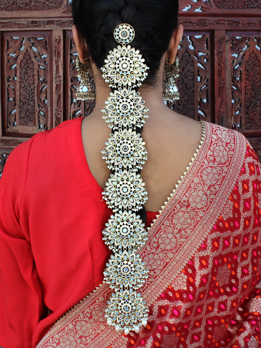 Gold tone braid decoration hair accessory / choti studded with CZs, faux pearls and mirrors.