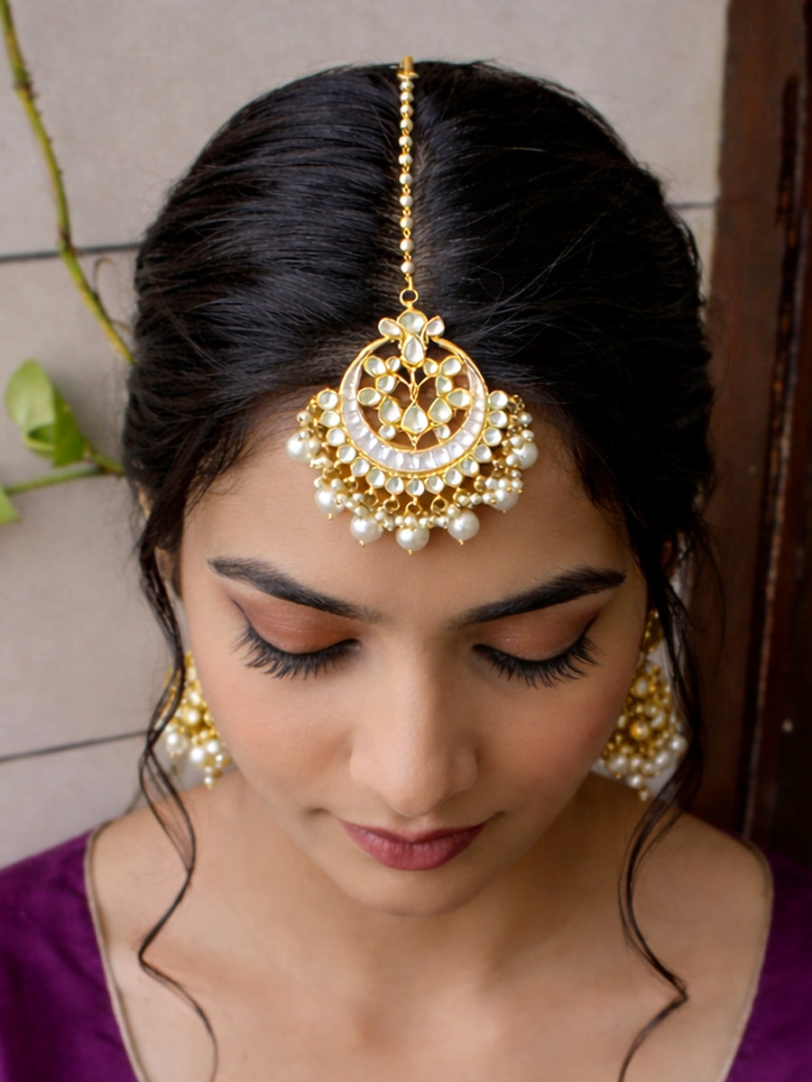 The Gold Plated Maang Tikka Studded with Simulated Kundans and Faux Pearls is a beautiful and traditional accessory. Here are the key details: