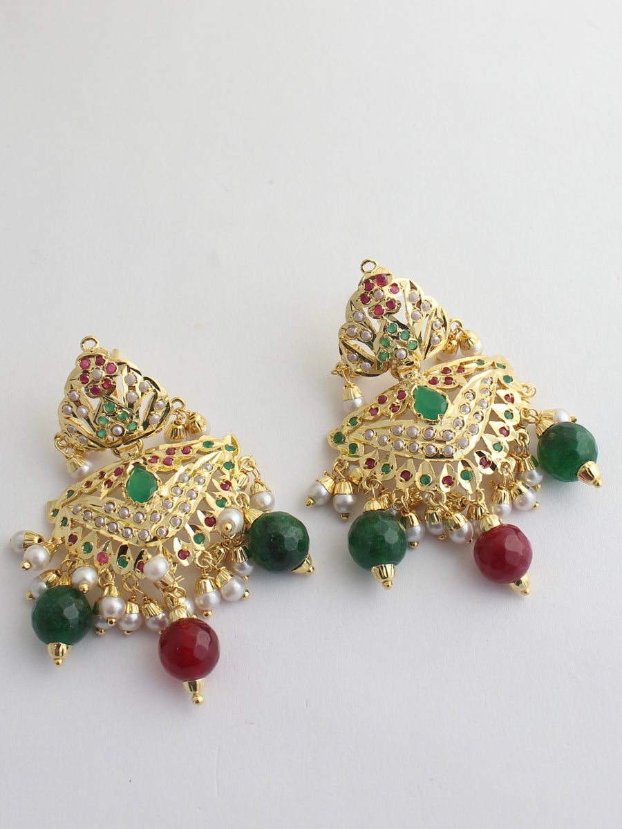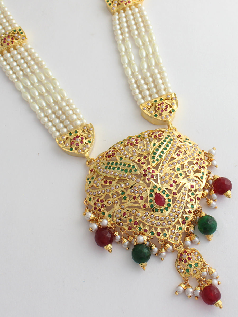 Gold Plated Jadau Ranihaar Necklace Set Studded with Ruby Pink, Green and Multicolor Stones Faux Pearl & Beads.