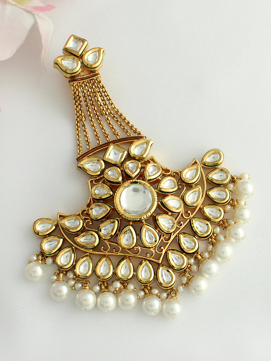 Gold Tone Mughal Jhoomer Studded with Simulated Polki Diamonds and Faux Pearls.