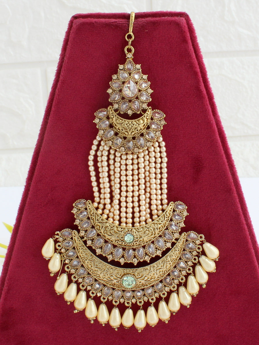 Gold Tone Hair Jhoomer Studded with Simulated Polki and Pearl Beads.