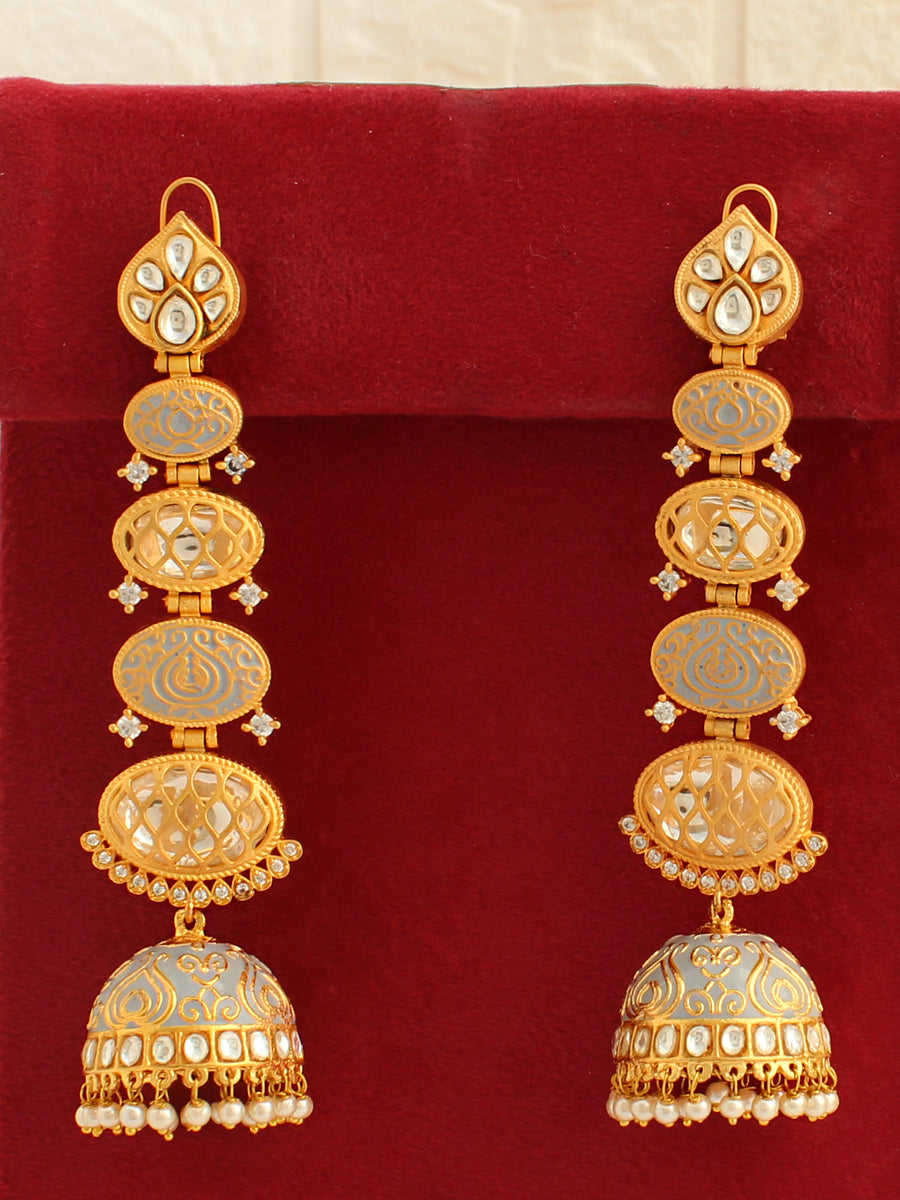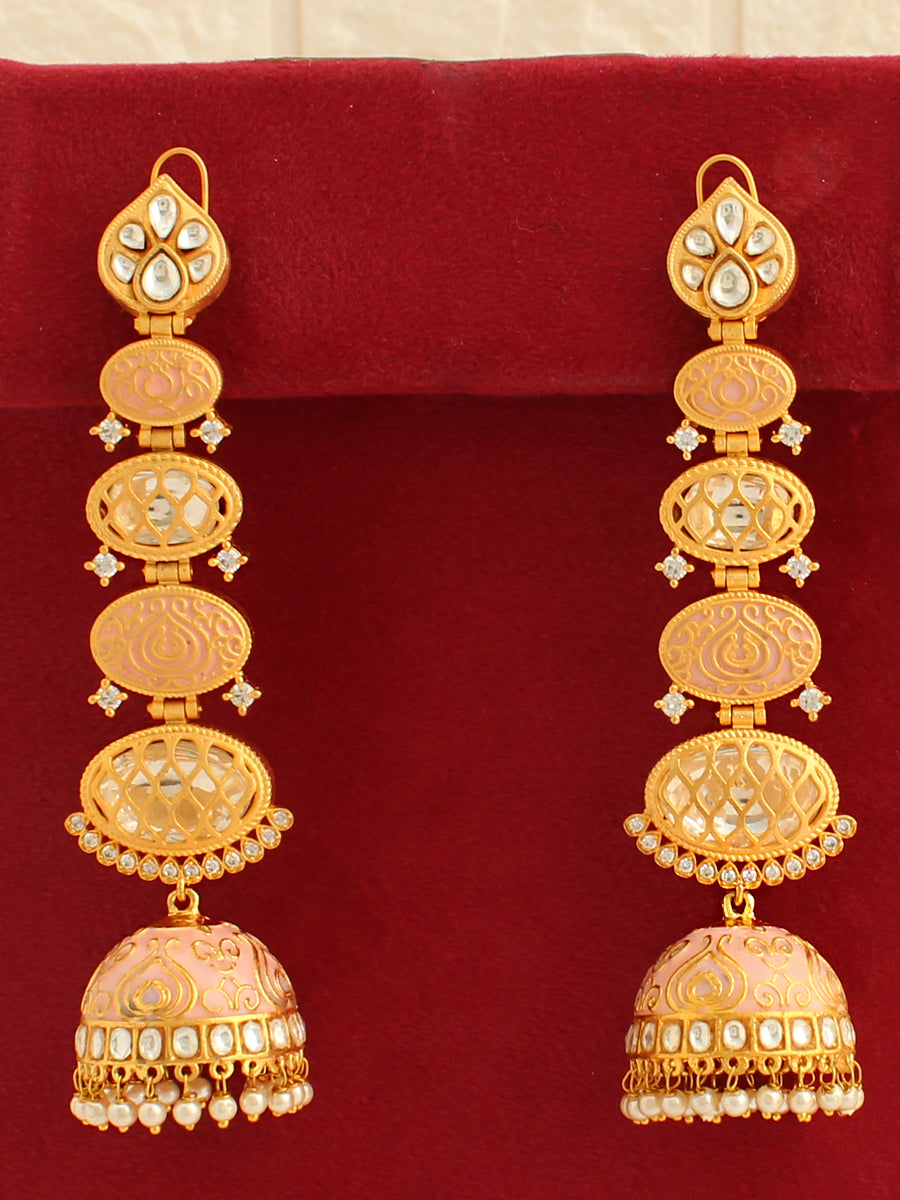 These earrings showcase a combination of simulated polki diamonds, CZs, and faux pearls, creating an elegant and traditional look. The addition of meena (enamel) work adds a touch of intricate detailing to enhance the overall design. The post back findings ensure a secure and comfortable fit for pierced ears. These jhumki/jhumka earrings are perfect for special occasions and celebrations.