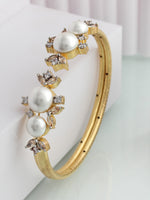 The Matte Gold Finish Bangle Bracelet is studded with simulated polkis and pearls. The bracelet has a fitted size of 2.4 and is made of brass.