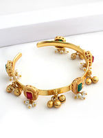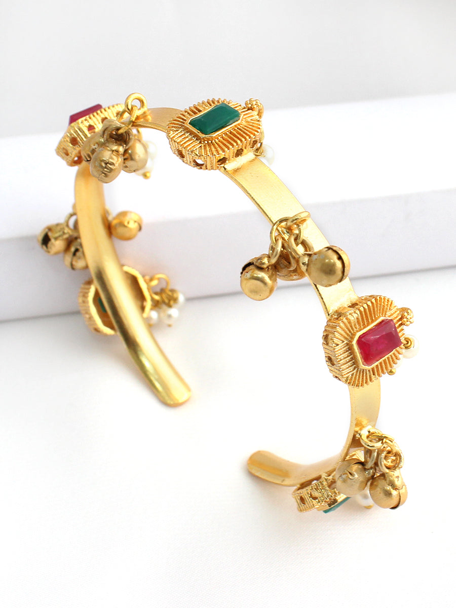Introducing the Yamika Bangle/Bracelet, an elegant fusion of tradition and grace. Beautifully studded with simulated maroon stones, enhanced with lustrous faux pearls and charming golden ghungroo, this piece adds a rich ethnic touch to any ensemble. Crafted for all-day comfort, it offers a perfect fit up to size 2.6, making it ideal for festive celebrations, weddings, and special occasions.