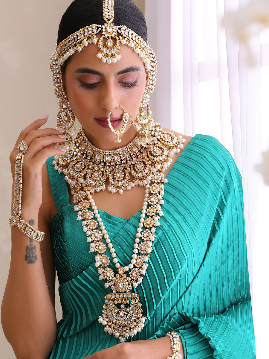 Radiant Beauty for Your Special Day: Emanate radiance with the timeless appeal of this Gold Tone Bridal Set. The simulated Kundan and faux pearls create a harmonious blend, ensuring you shine on your wedding day.