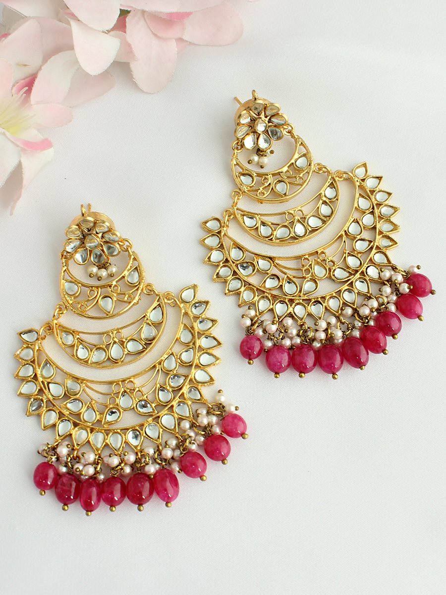 Introducing our gold tone chandbali earrings, adorned with simulated kundas, faux pearls and hot pink beads. Crafted on a base of high-grade alloy metal. The post-back findings ensure secure and comfortable wear,