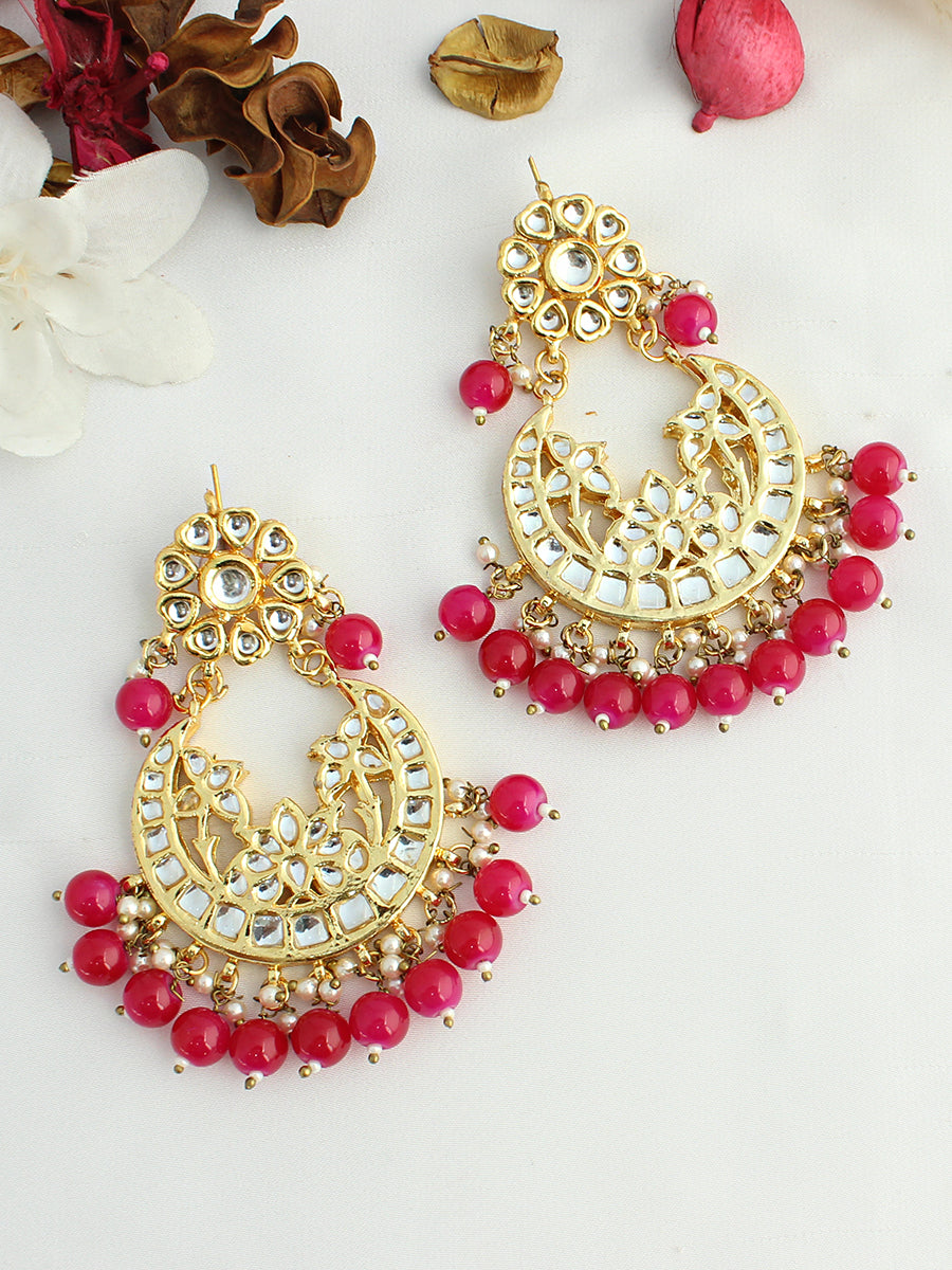 Presenting our Gold Tone Chandbali Earrings, adorned with Simulated Kundans and Blue, Pink, Aqua and Hot Pink beads for a regal and traditional touch. Crafted on a base of high-grade alloy metal. Style them with your favorite traditional outfit and grab the light on your special day.