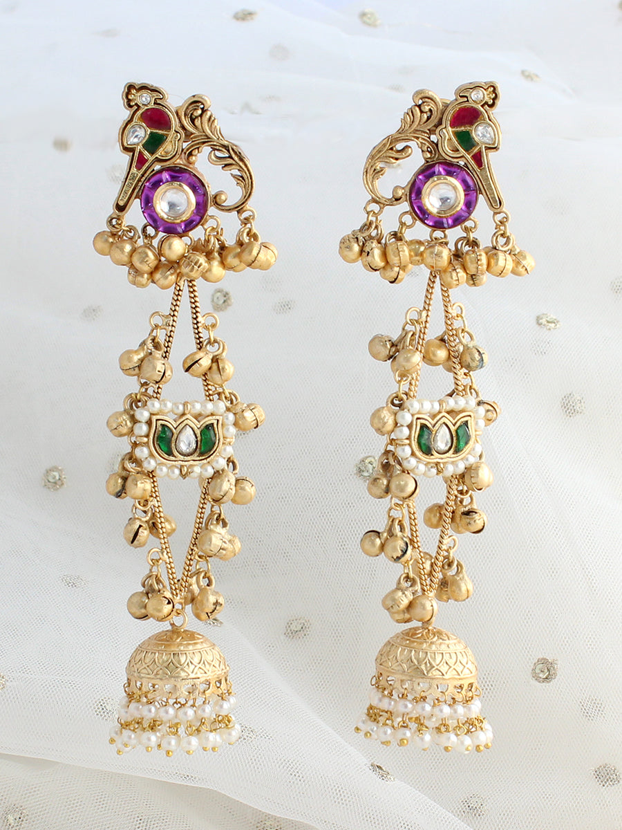- Design: Gold plated long Jhumki earrings with simulated stones, faux pearls, and golden beads.