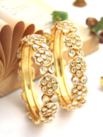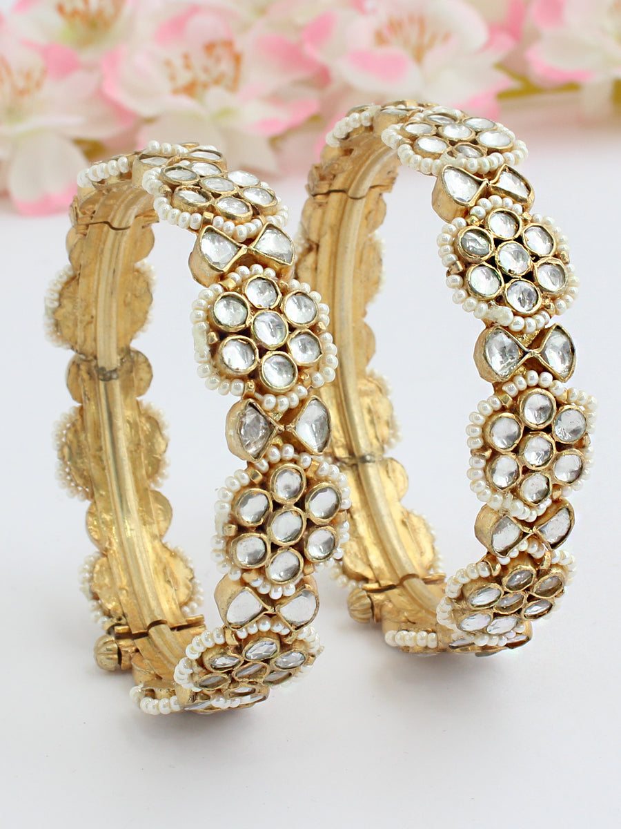 1 Pair Gold Plated Screw Opening Bangle Studded with Simulated Kundan and Pearl Beads.