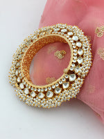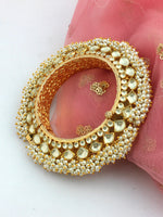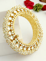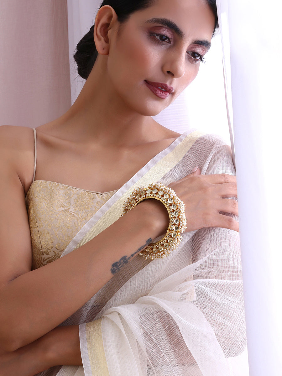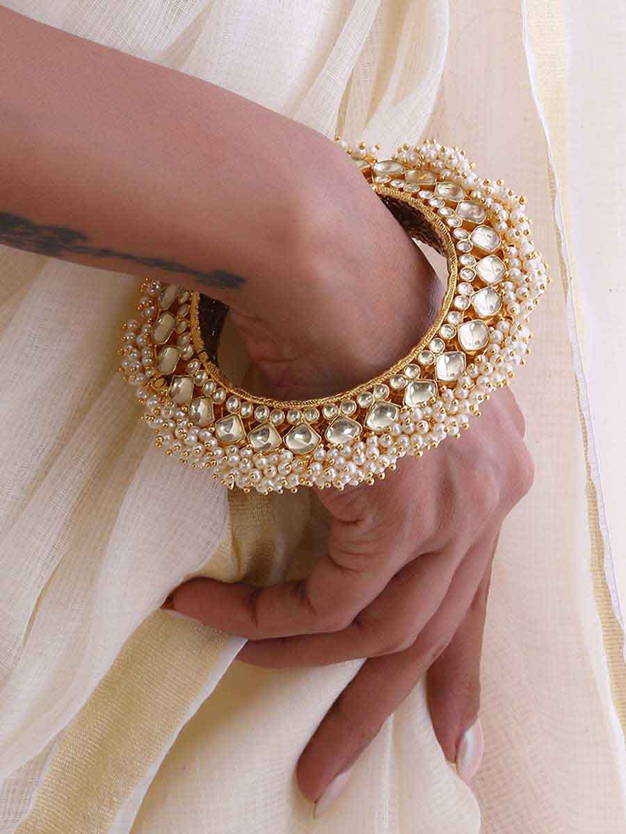 The gold tone screw opening bangle is studded with simulated polki Kundans pearls, red, and golden beads. The base is made of high-grade alloy metal.