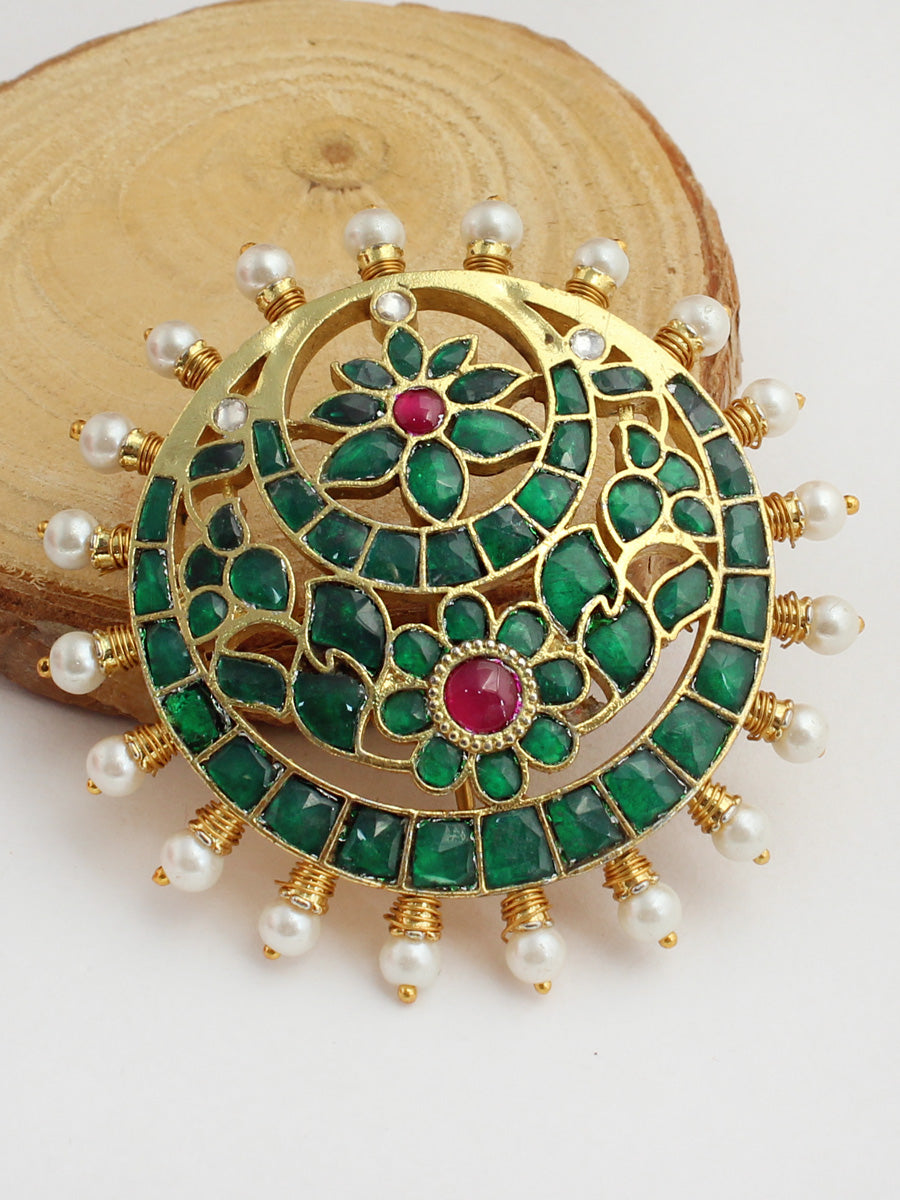 Gold plated hair bun pin studded with simulated pink, green kundans and faux pearls.