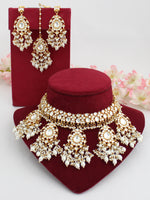 Gold plated bib necklace set studded with simulated kundans, faux pearls.