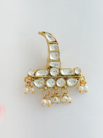 - Gold plated hair bun pin studded with simulated kundans and faux pearls.