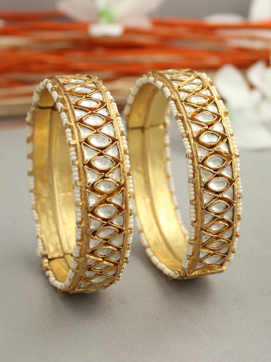 1 Pair gold plated screw opening bangle studded with simulated Kundans and pearl beads.