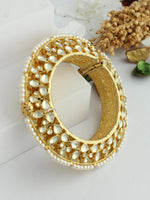 Elevate your style with this stunning Gold-Plated Screw Opening Bangle, adorned with Simulated Kundan and lustrous Pearls.