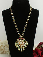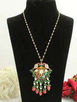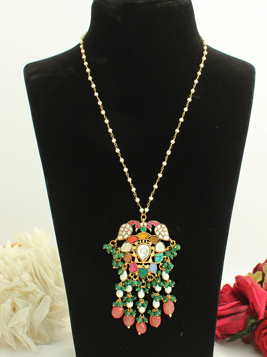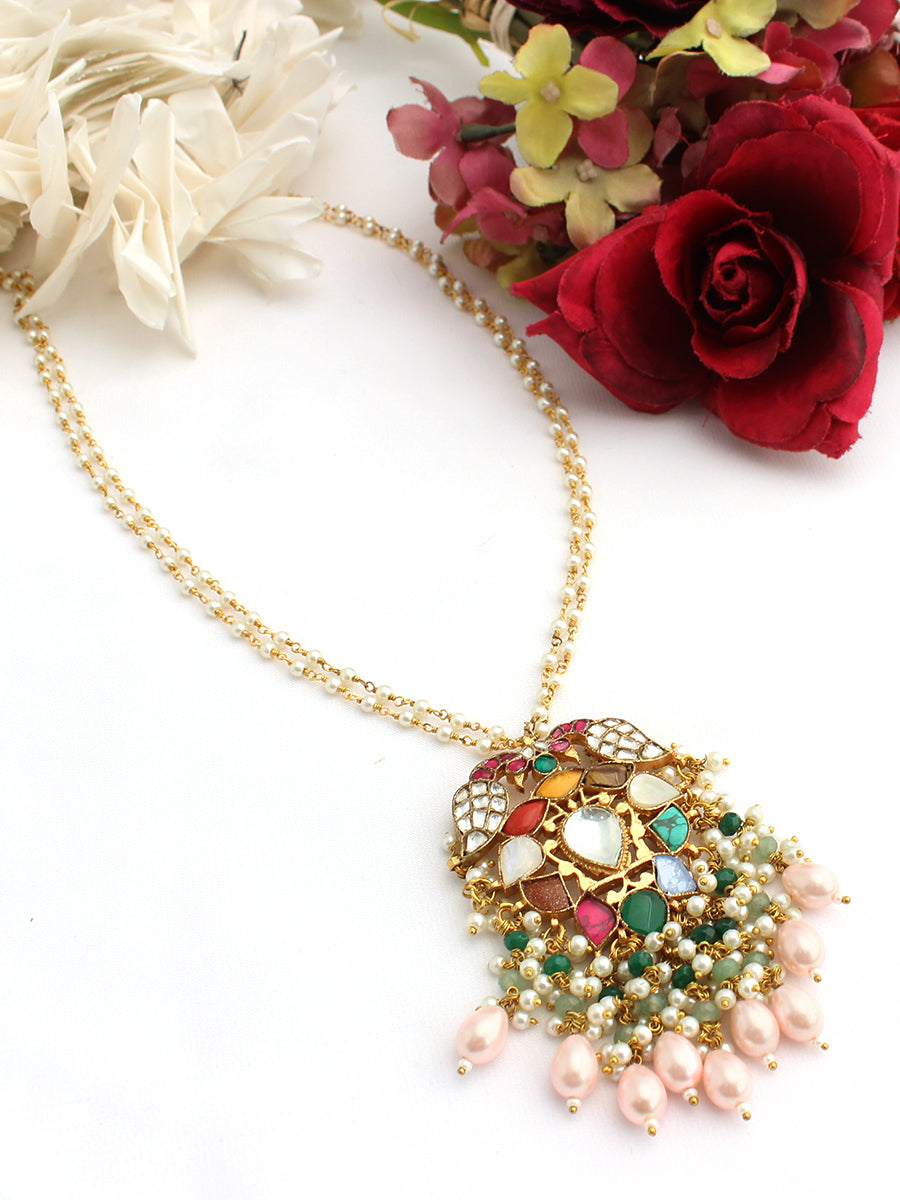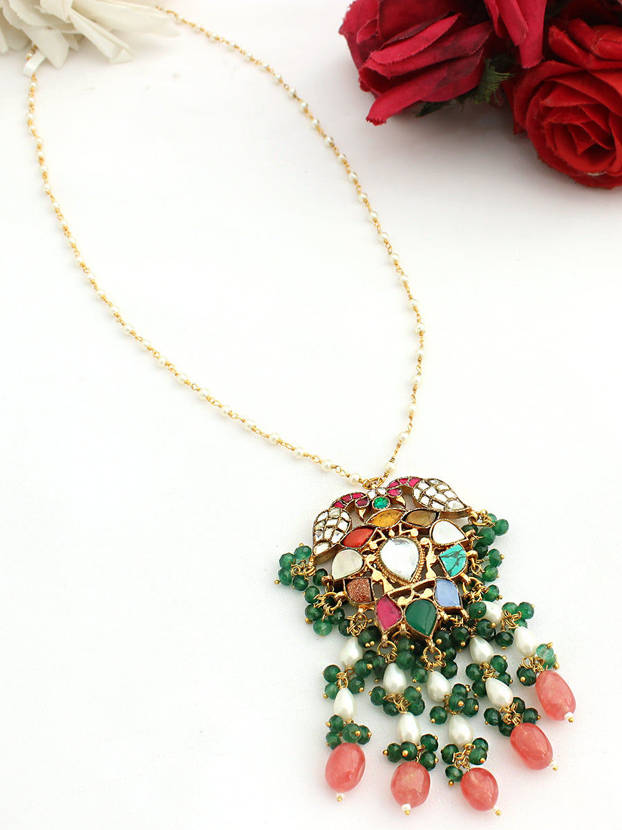 Introducing our gold-plated long pendant necklace is a true statement piece, meticulously crafted with intricate simulated kundans, vibrant navratna (multi) stones, and beads. The perfect fusion of traditional design with colorful, rich accents adds a touch of regal elegance to any ensemble. Ideal for weddings, festive occasions, or evening events, this necklace exudes luxury and charm. Its timeless beauty effortlessly elevates your style, making it an essential accessory for those who appreciate the perfect blend of classic sophistication and contemporary flair.