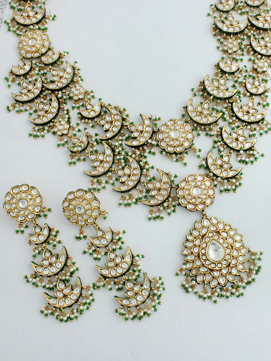 Gold Plated Long Necklace Set Studded with Simulated Kundan and Faux Pearl Beads.
