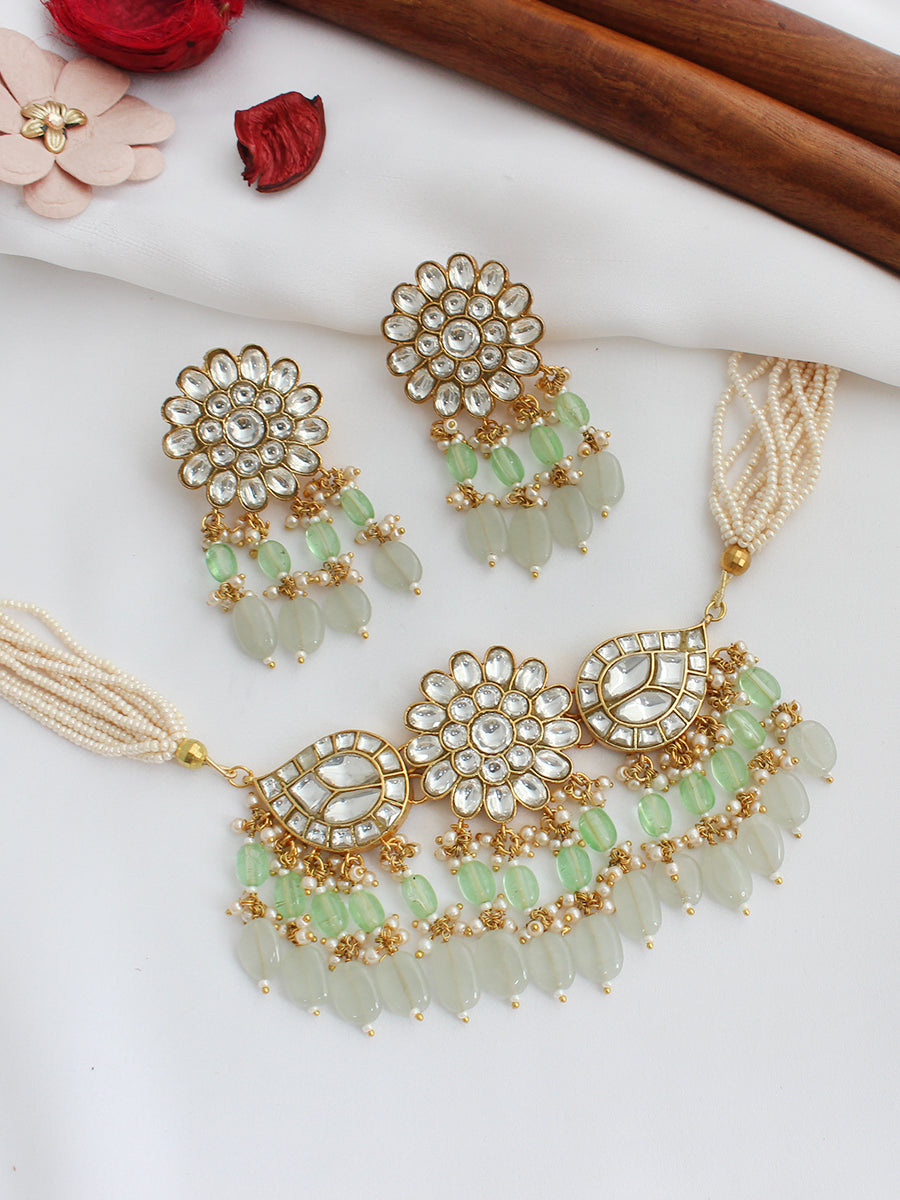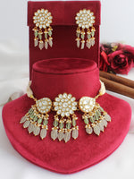 Enhance your traditional attire with this exquisite Gold-Plated Choker Necklace Set, meticulously crafted from durable alloy metal. The set features simulated Kundan, faux pearls, and a vibrant mix of green and hot pink stones and beads, creating a rich, eye-catching appeal. Designed for both comfort and elegance, The choker includes an adjustable cord for a comfortable and secure fit across different neck sizes. Paired with matching oversized stud earrings, this set is the perfect blend of elegance and festive charm—ideal for weddings, parties, and cultural occasions.