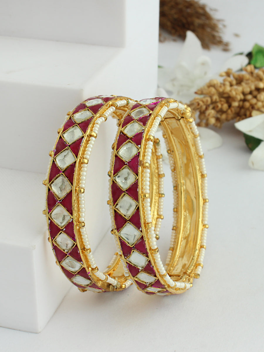 1 Pair gold plated screw opening bangle studded with simulated kunadns, Hot Pink Stones and pearl beads.