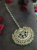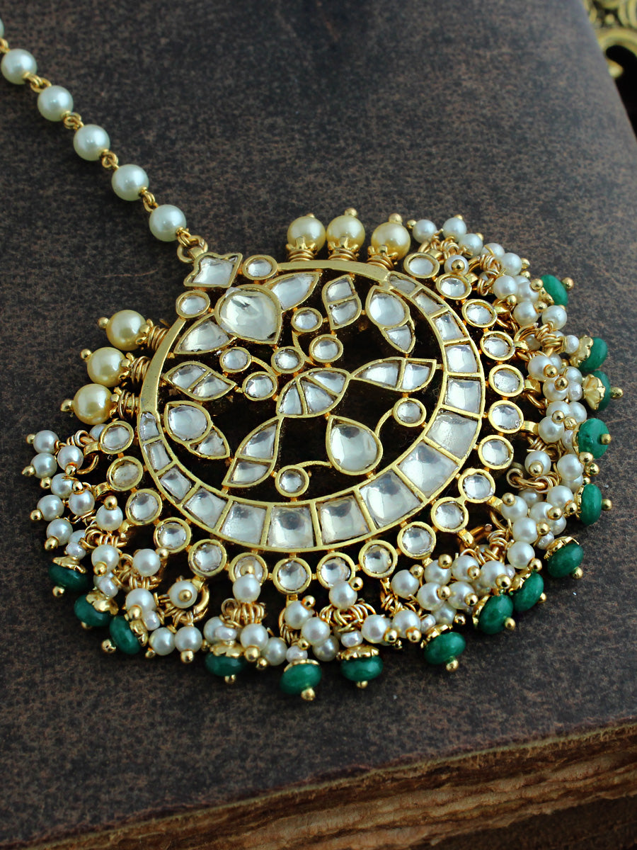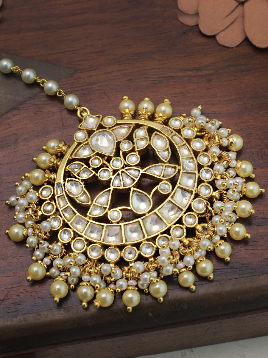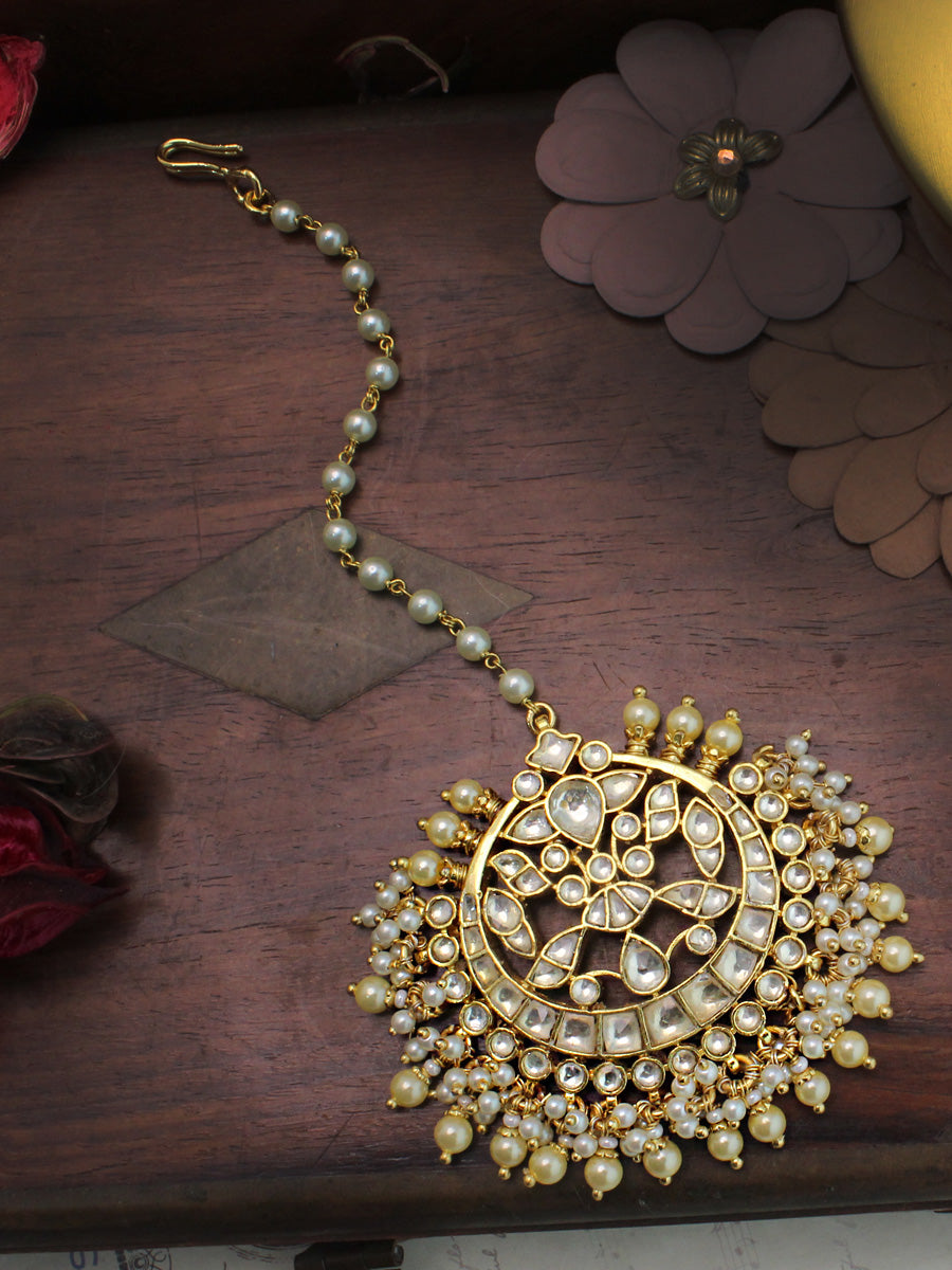 The gold-plated maang tikka is studded with simulated Kundans and faux pearls. The tikka measures approximately 6 1/2" in length, and the width on the forehead side is 50mm or 2". The base is made of high-grade alloy metal.