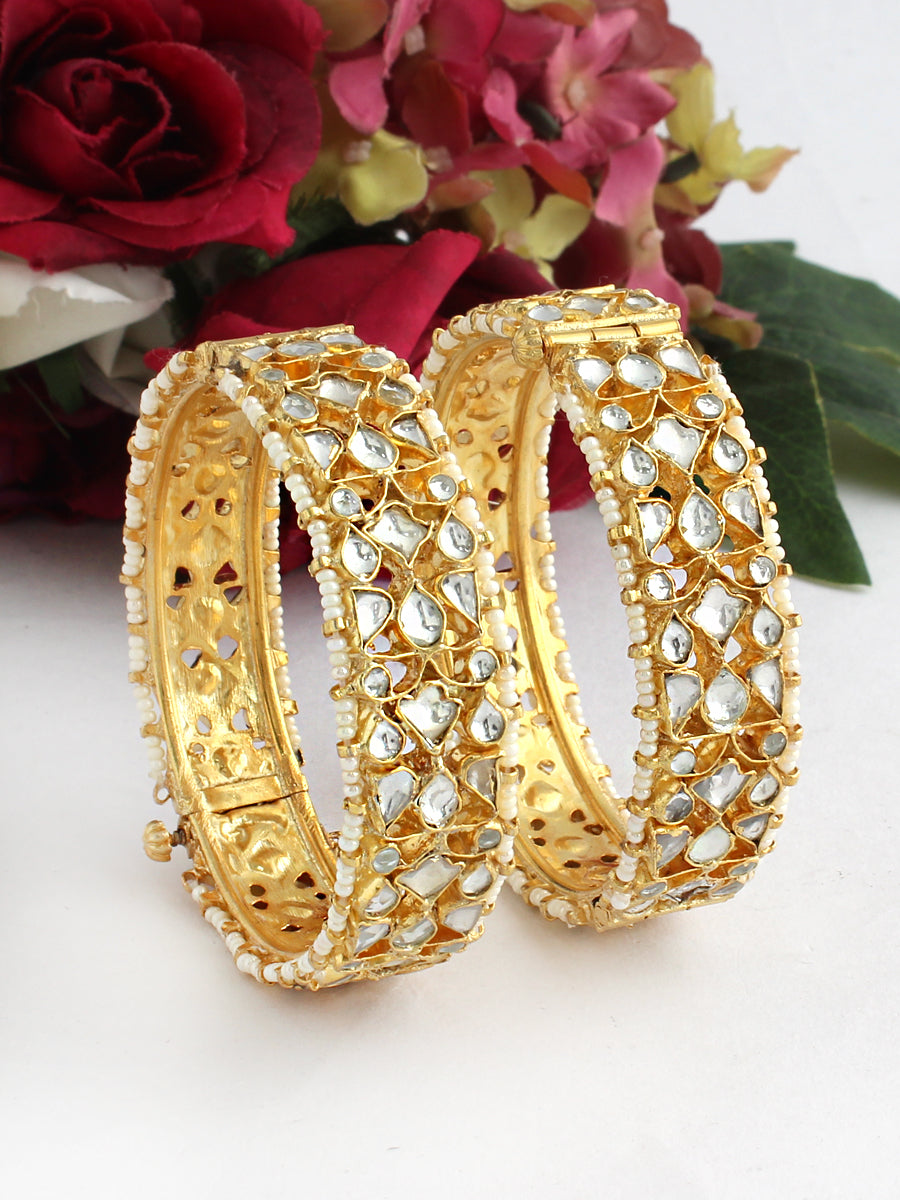 1 Pair gold plated screw opening bangle studded with simulated kundans and faux pearls.
