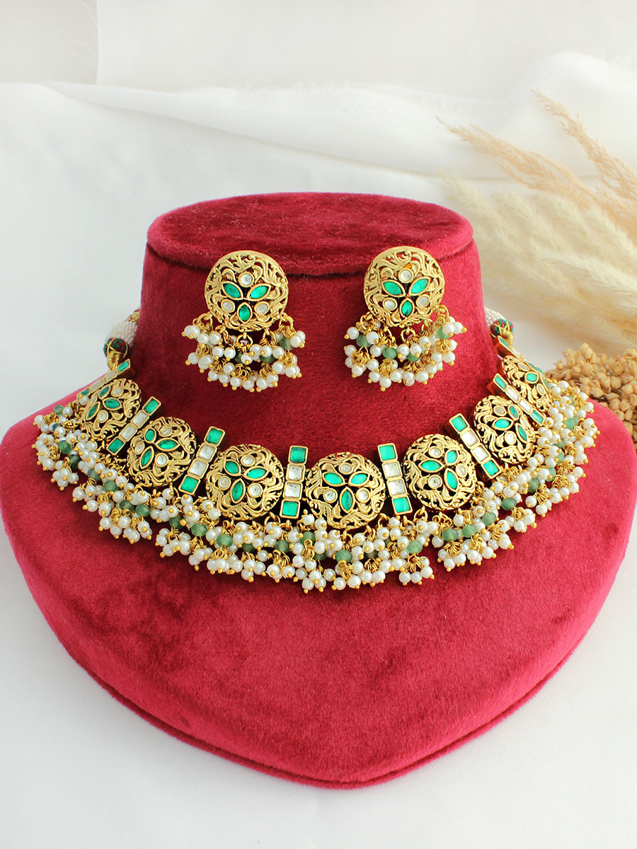 Introducing our stunning Gold Plated Bib Necklace, adorned with exquisite simulated kundans, vibrant green stones, and elegant faux pearl beads. This traditional piece captures the essence of regal style, making it a perfect addition to your jewelry collection. The matching earrings beautifully complement the necklace, creating a sophisticated and elegant look.