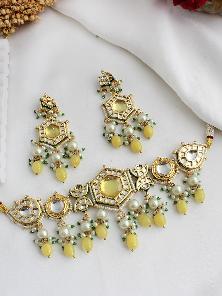 Introducing our Gold Tone choker necklace set studded with simulated kundans, faux pearls, , green, yellow stones and beads.
