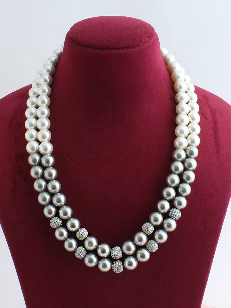 Silver tone 2 layered necklace studded with grey pearls and embedded CZs balls.