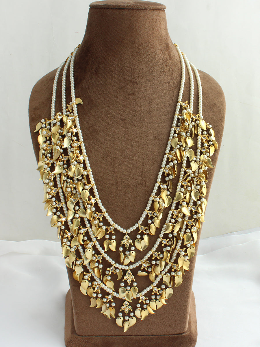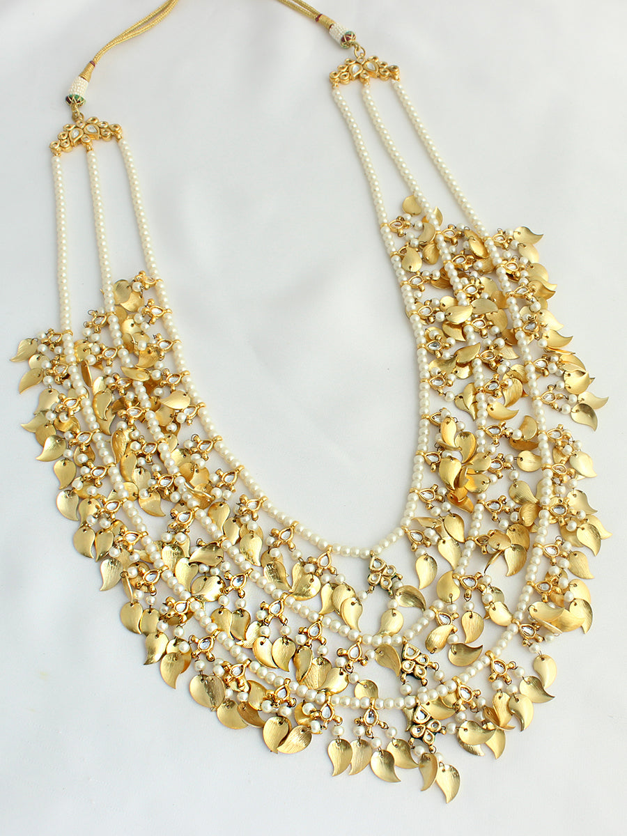 "Introducing our Gold Plated 3 Layered Necklace, adorned with simulated kundans, faux pearls and golden pipal Pattis for a royal and elegant touch. Crafted on a base of high-grade alloy metal, this necklace combines traditional craftsmanship with modern design, creating a statement piece that enhances your grace and style.