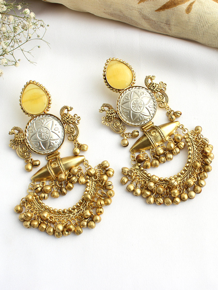These beautifully designed two-tone long earrings are crafted on a sturdy alloy metal base and feature a captivating simulated green stone centerpiece. Rich in traditional artistry, the earrings showcase intricate detailing with graceful peacock motifs and layered golden beads that add movement and charm.